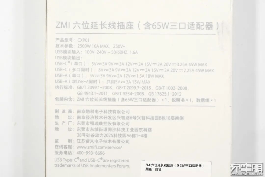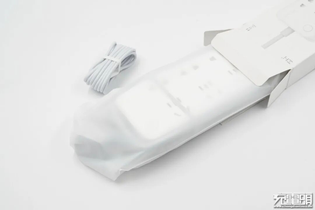 外包装上方是“ZMI”LOGO,右边标注了里面含有数据线,作为USB插线板来说考虑的很周到。