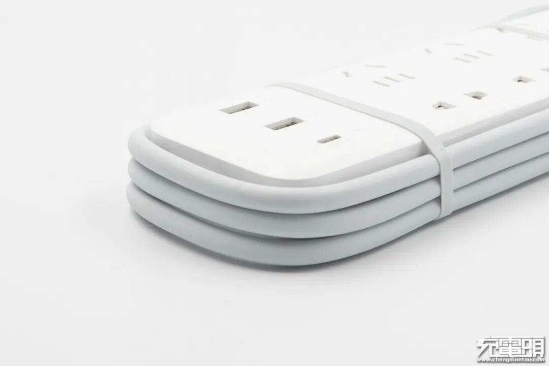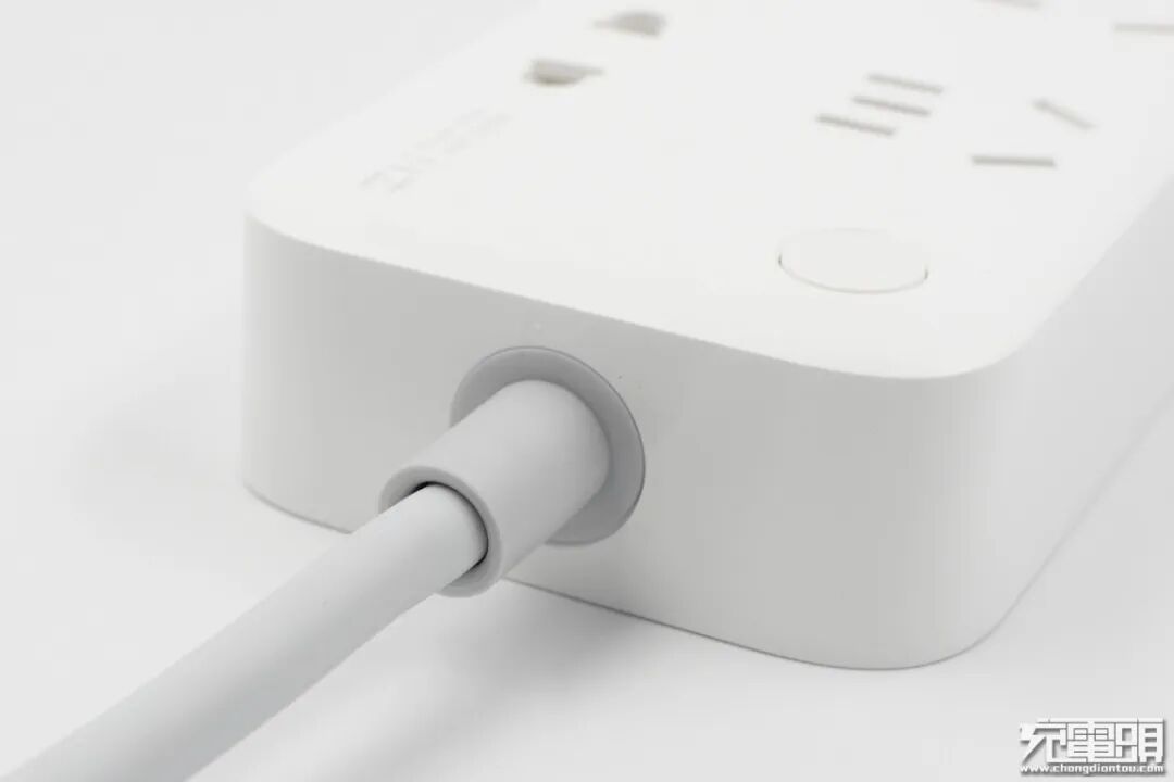 紫米插线板出线口使用了一个灰色加厚保护套,避免日常使用中拉扯造成线材外皮受损。