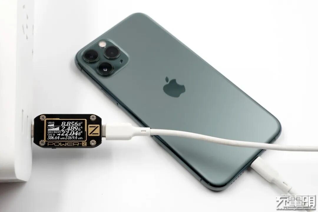 iPhone11 Pro 支持USB PD和Apple2.4A快速充电协议,为iPhone11 Pro充电,功率为8.85V 2.48A 22.04W,成功握手USB PD快充协议,并达到USB PD功率最大阶段。