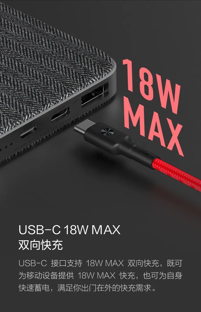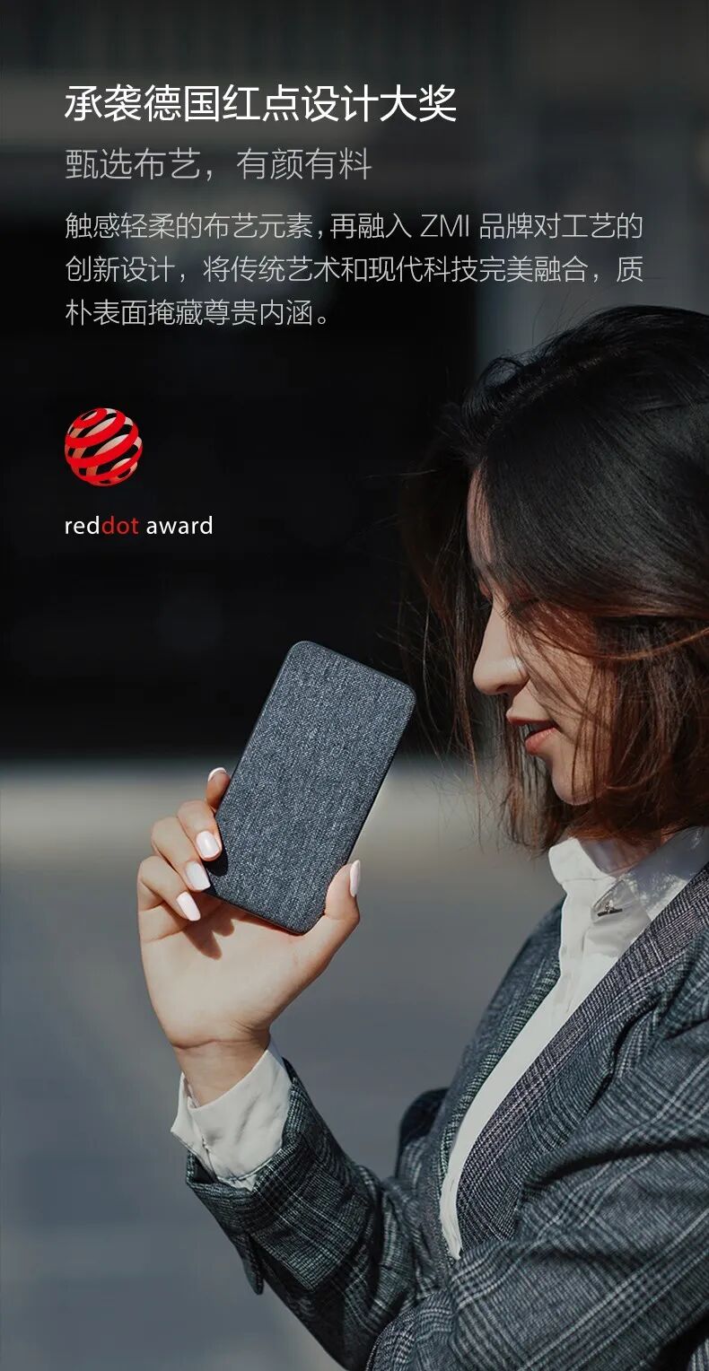此次紫米最新推出的双向快充移动电源尊享版外观采用布艺覆盖设计,拿在手中也不会有冰凉的感觉并且在和手机拿在一起时为手机充电也不会划伤手机的后盖。外型小巧,轻便。便于携带。