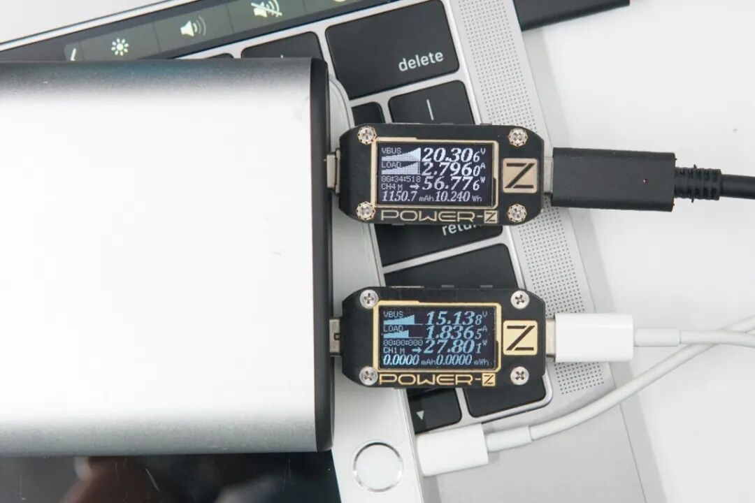 同时使用移动电源的双USB-C为MacBook Pro和iPad Pro充电,为MacBook Pro充电,功率为20.30V 2.79A 56.77W;为iPad Air 3充电,功率为15.13V 1.83A 27.80W。两个USB-C在同时输出时均可以开启快速充电。