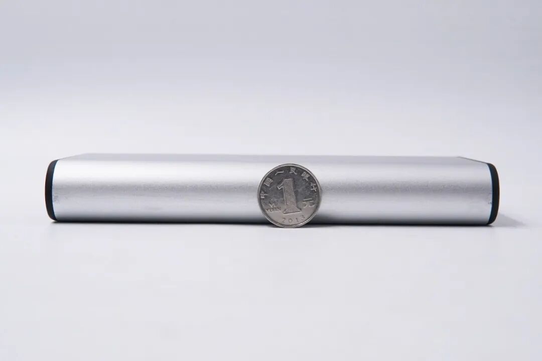 和一元硬币对比一下高度,基本上移动电源的厚度和一元硬币的高度一样。
