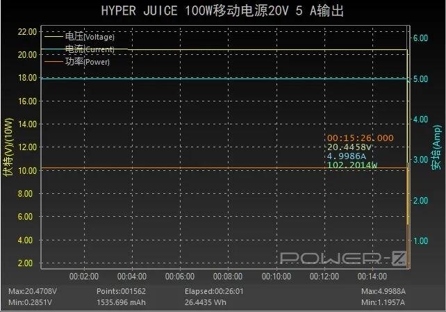 HYPER JUICE PD移动电源支持100W的大功率输出,在实际的测试当中可以看到输出的功率为20.47V 4.99A 102.2W,以及超出了标定的最高输出功率。强悍的输出性能,也为移动电源本身添加了闪光点。
