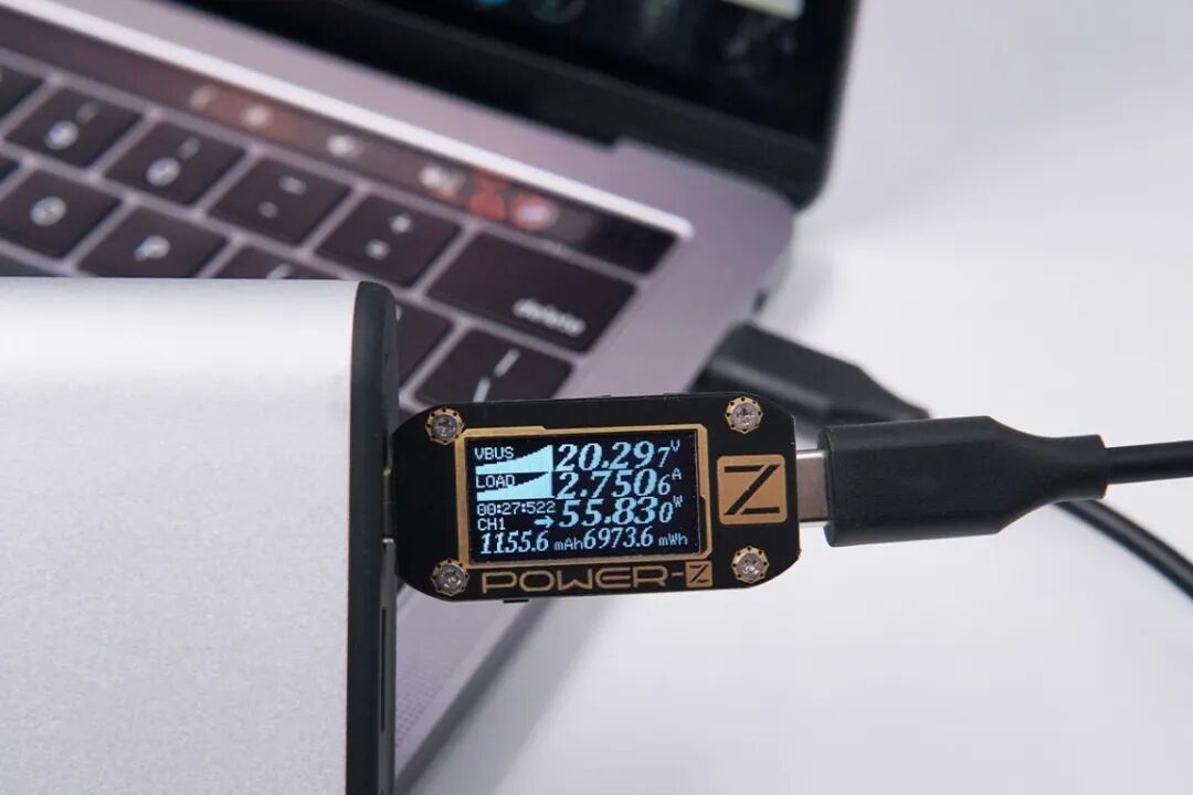 Macbook Pro 13支持USB PD快速充电,使用移动电源的USB-C为Macbook Pro 13充电,功率为20.29V 2.75A 55.83W,成功握手USB PD快充,并达到快充功率最大阶段。