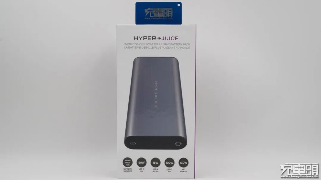外包装的正面,上面带有HYPER JUICE的Logo标识,中间大块区域呈现着产品的外观,下方标注出了产品的几大特点,内置27000mAh的电池容量、支持60W和100W的功率输出、最高支持130W的输出功率。
