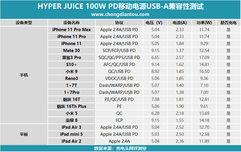 此外小编还找来了数款手机和平板来测试兼容性。从表中来看,黑鲨3 Pro和小米9充电功率排在前面。均超过了16W;S10+等安卓机系列排在后面。功率在12W-15W之间;随后是苹果系列产品和华为Mate30手机,功率在11W与13W之间。