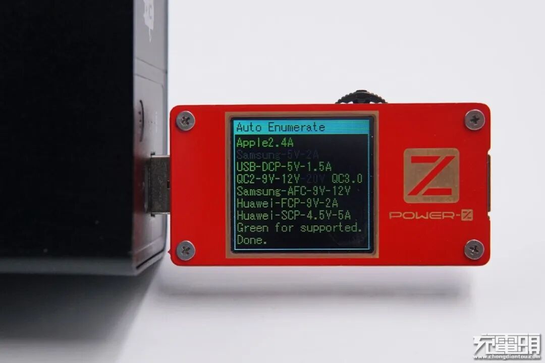 既然带有USB接口,当然要测试一下支持什么样的快充协议了,使用POWER-Z KT001对PowerBen的USB-A接口进行检测,支持Apple2.4A、QC、AFC、FCP、SCP等快充协议。