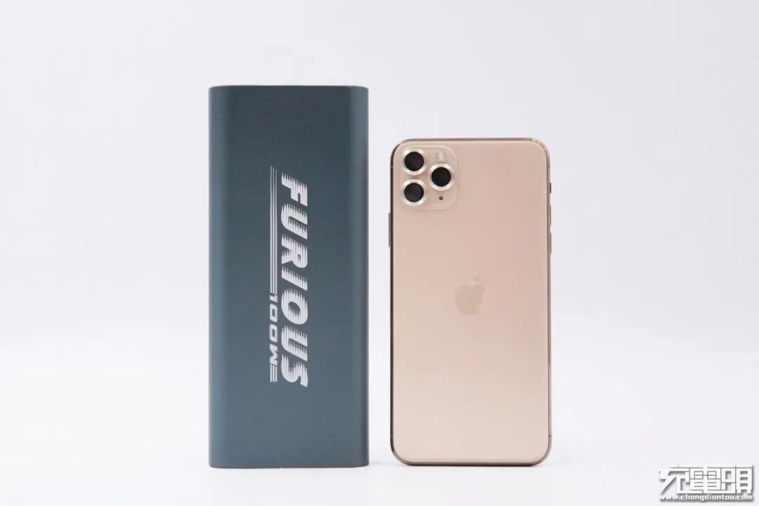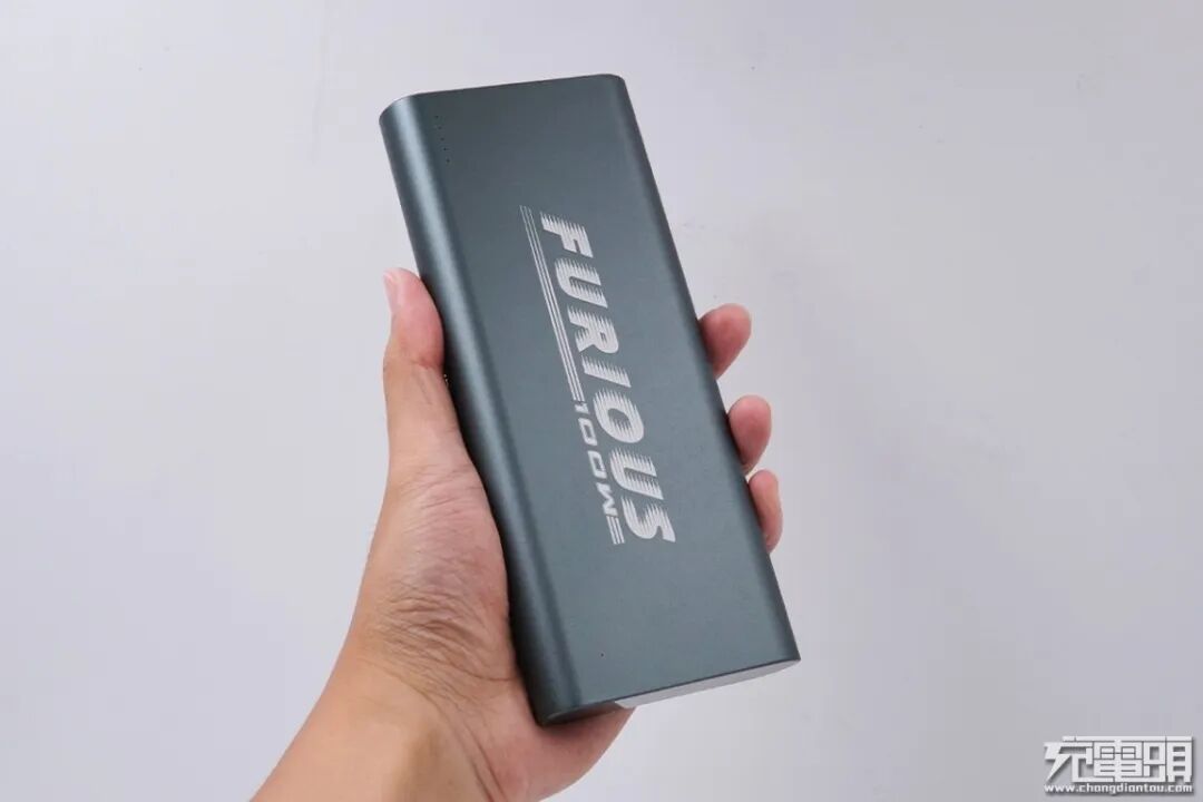 移动电源整体呈现灰绿色的外观,上面带有FURIOUS 100W的标识,意为狂暴输出100W大功率,移动电源的上下两侧为平面设计,四周边角过渡圆润。