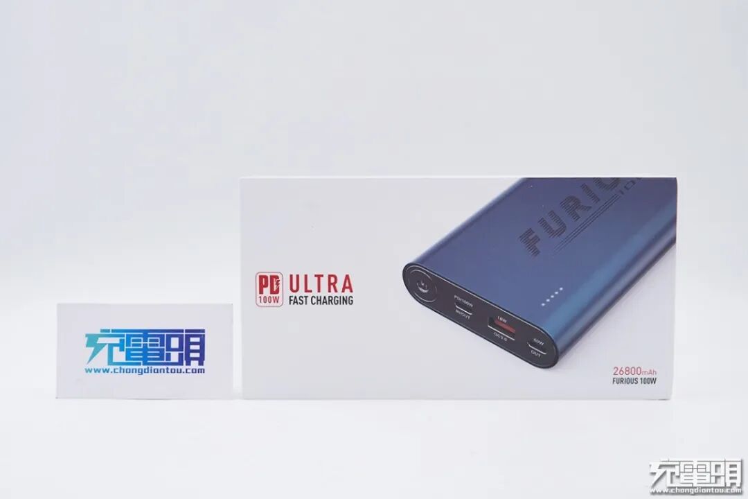 外包装整体呈现白色外观,右侧展示出了产品的主要部分,下方带有电池容量信息,内置26800mAh电池容量,100W狂暴输出。左边带有PD 100W的字样,支持快速充电。