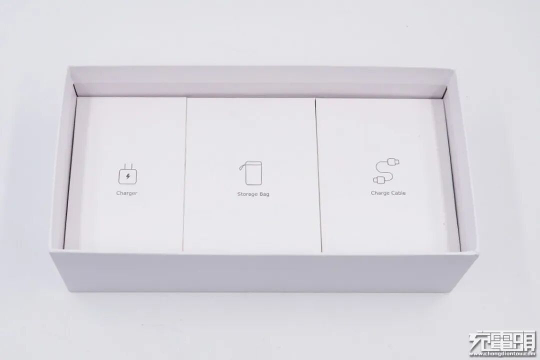最后一个包装盒内附带的是充电器,方方正正的造型设计,边角部分圆润过渡处理,这样整体看上去显示更加的圆滑,不会过于突兀。