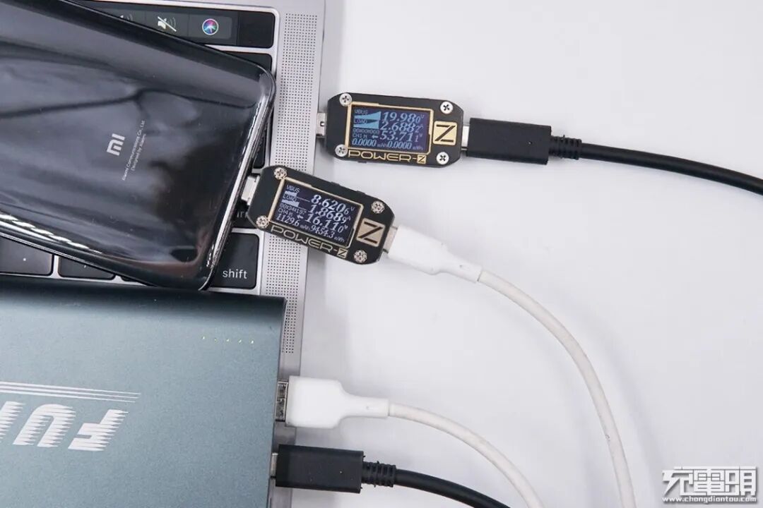 使用USB-C(100W)为 MacBook Pro充电,功率为19.98V 2.68A 53.71W;使用USB-A为小米9充电,功率为8.62V 1.86A 16.11W。1C1A可以同时输出为设备充电且均处于快充输出模式。