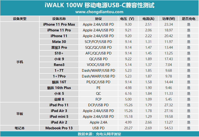 将测试的数据整理到表格当中,MacBook Pro的充电功率自然最高,达到了54.53W,其次是支持PD快充协议的苹果设备,功率在18W-27W之间,支持PD快充协议的安卓设备排在后面,功率在11W-18W之间,iPad Air 2也成功握手Apple2.4A快充协议,并达到了快充功率最大阶段。