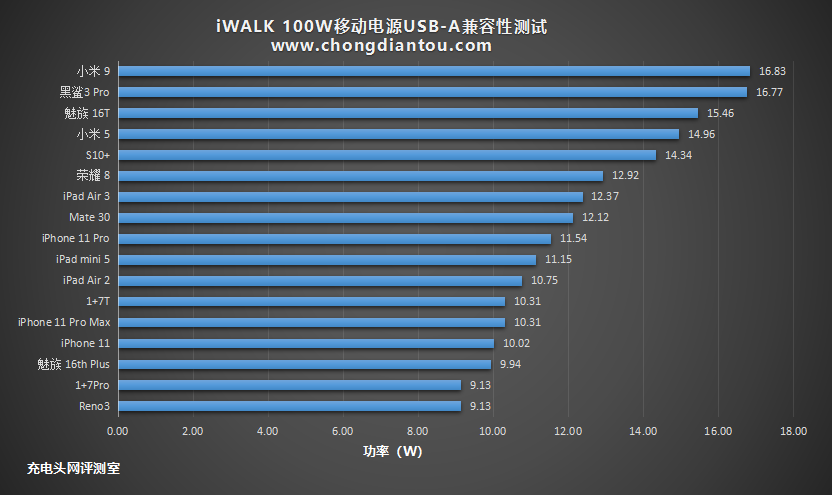 小编还选取了数款手机与平板对USB-A的输出兼容性进行了测试,从表格的数据中可以看得出来,小米9和黑鲨3 Pro的充电功率最高,达到了16.83W和16.77W,其余支持QC快充协议的安卓手机排在后面,功率在14W-16W之间;支持FCP快充协议的华为手机紧随其后,功率在12W左右;支持Apple2.4A快充协议的苹果设备在排在后面,功率在10W-12W左右。