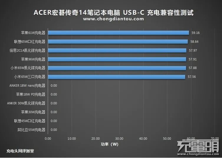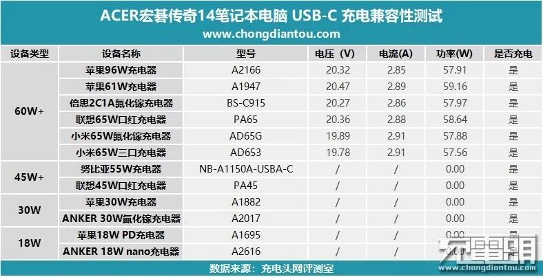 把测试数据制作成表格,可以看到ACER宏碁传奇14笔记本电脑只支持60W以上的PD充电器,45W、30W、18W等低于60W的PD充电器无法对它充电。