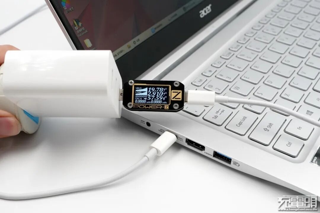 小米65W三口充电器(AD653)对宏碁传奇充电,功率19.78V 2.91A 57.59W,顺利握手USB PD快速充电,并达到笔记本最大充电功率。