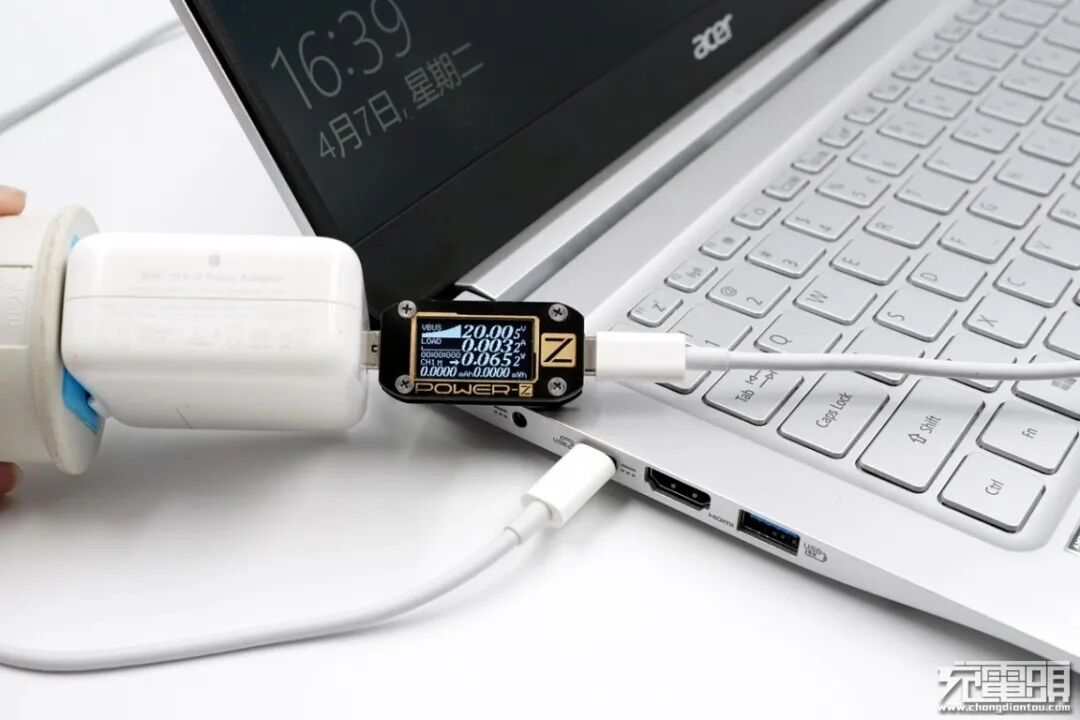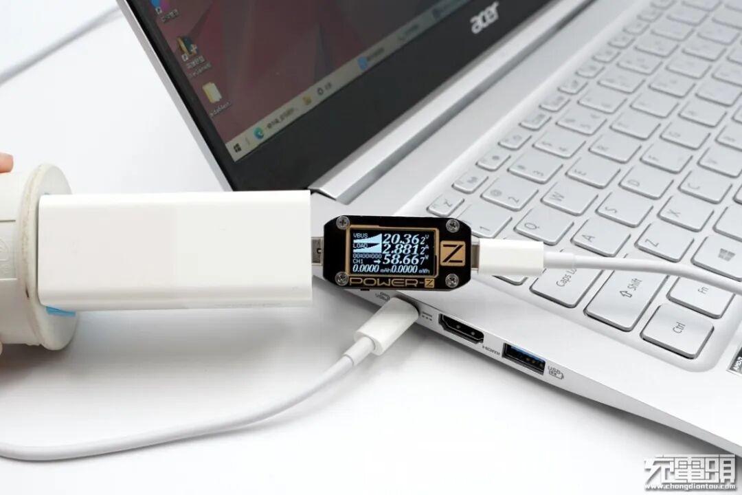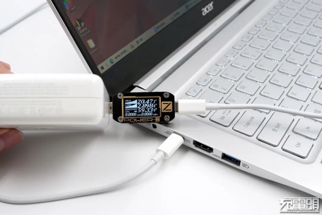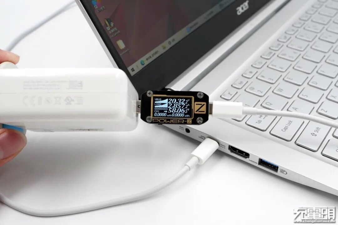 苹果61W充电器(A1947)对宏碁传奇充电,功率20.32V 2.85A 58.06W,顺利握手USB PD快速充电,并达到笔记本最大充电功率。