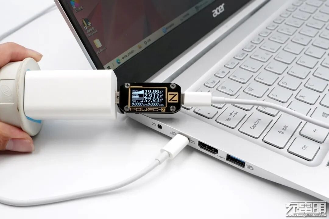 小米65W氮化镓充电器(AD65G)对宏碁传奇充电,功率19.89V 2.91A 57.93W,顺利握手USB PD快速充电,并达到笔记本最大充电功率。