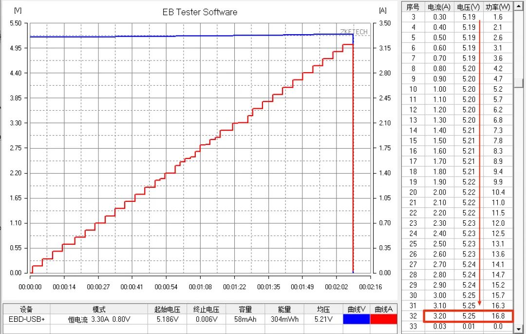 这是USB-A口的数据,5V状态可以拉到3.2A、功率16.8W,并且看出虽然A口支持的充电协议很少,但具备线补能力,可以保障充电效率。