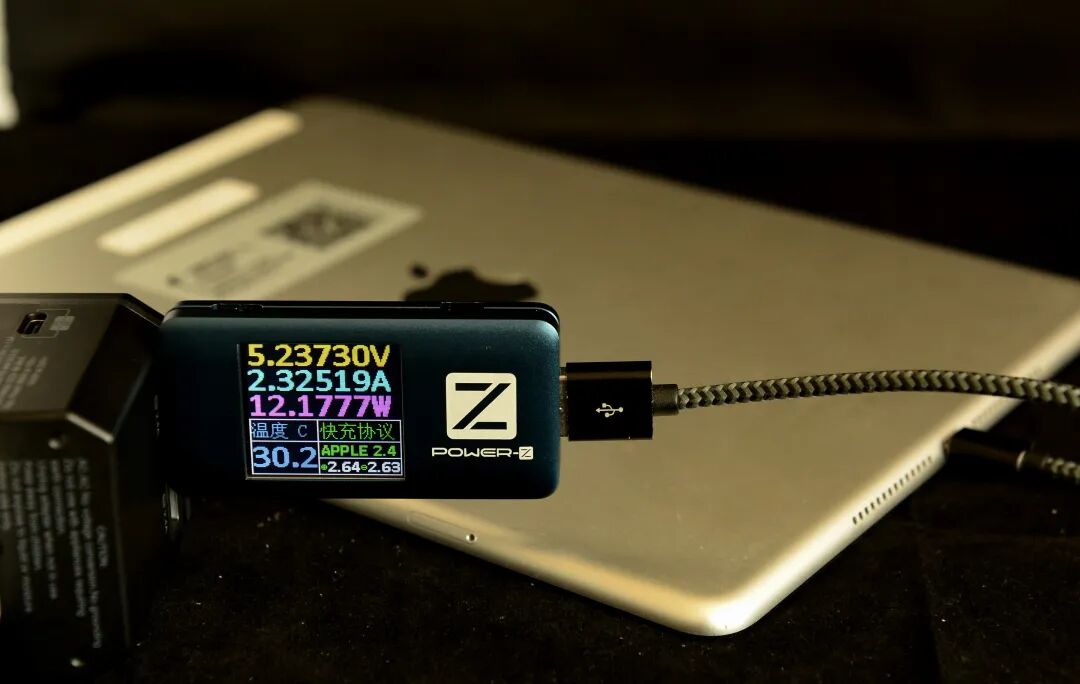 USB-A口给Ipad air2充电,输出5.237V2.325A 12.178W。