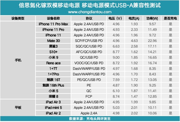 将产品作为移动电源时的USB-A输出接口的测试数据放在表格当中,从数据上来看,Mate30成功握手SCP快充协议,充电功率最高;其次是支持QC快充的安卓设备。支持Apple2.4A的苹果设备排在后面,成功握手Apple2.4A快充协议。此外,产品作为移动电源时USB-A输出接口还支持FCP快充协议。