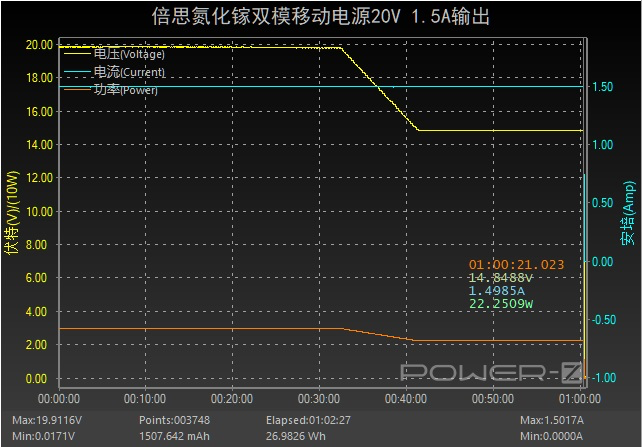 3、30W最后再以20V 1.5A档位进行输出效率测试,32分钟前,电压、电流以及功率平台均持稳定输出状态,随后由于移动电源内部剩余电量下降,输出功率降至15V 1.5A 22.5W,随后持稳定输出状态,持续了约10分钟,全程耗时约1小时。放出的能量约为26.98Wh,所以移动电源的效率约为26.98/38.5=70.08%。这是由于目前移动电源产品在满载大功率输出时会持续一段时间后由于剩余电量的减少而出现输出功率下降的情况,属于正常现象,而且倍思的这款产品在大功率满载输出时持续了半个小时,在目前的市场上也是不错的表现了。