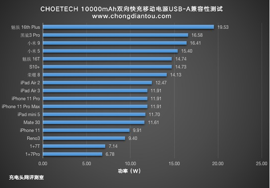 小编还将数款手机和三款平板的充电数据放在了表格当中,从表格的数据来看,魅族 16th Plus功率最高,达到了6.83V 2.86A 19.53W,成功握手PE快充,这款移动电源的USB-A还支持PE快充协议;其次是支持QC快充的安卓手机,均成功握手QC快充,支持Apple2.4A快充协议的苹果设备也可以成功握手快充,并且大部分都达到了快充功率的最大阶段。将测试的数据以柱状图的形式表现出来,这样可以更直观的看出充电功率的大小,仅支持PE快充协议的魅族 16th Plus成功握手PE快充,功率达到了19.53W;支持QC快充协议的安卓设备紧随其后,功率在11W-17W之间;支持Apple2.4A的苹果设备也可以很好的握手快充协议,开启快速充电模式。