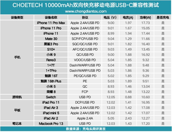 2、USB-C小编还找来了数款手机与平板还有笔记本电脑和Switch对移动电源的USB-C进行充电测试,从测试的数据可以看的出来,支持PD快充的苹果设备成功握手PD快充;其次是支持PD快充的安卓设备,同样成功握手PD快充协议,仅支持Apple2.4A的iPad Air 2也可以成功握手快充,开启快速充电模式。仅支持QC和FCP等单快充协议的手机也可以成功握手相应的快充协议,开启快速充电模式。