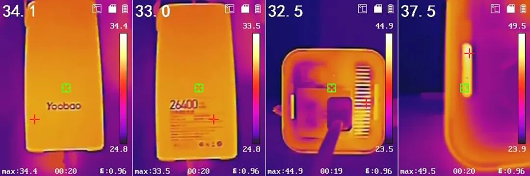 储能电源在逆变输出时,由于发热的关系达到一定温度后机器内置的散热风扇就会工作,风扇工作时有一定的噪音。80W工作约20分钟后用测温仪测量的温度如上图。整体温度并不高,室温27度,外壳34度左右;逆变器散热栅口最高约45度,沿着横向栅口,探出内部最高温度49.5度,温控🌡表现非常好。