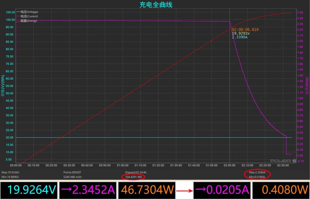 接通电源看出双方握手20VPD协议,以19.9264V 2.3452A 46W多的功率充电;恒流状态输入稳定,持续了正好2小时时间,此时EN1S上的电量指示为56%;在随后的恒压状态,电流逐步下降,经过了32分钟后充电结束。EN1S上的电量显示65%,嗯❓机器上的电量显示也太不准了吧!希望厂家能及时改进。