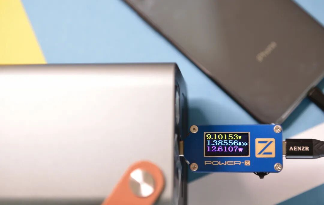 两部手机充电状态,Type-C口接入大功率设备时,Type-C口也只能工作在5V,输出电流控制在3A,下面的Iphone X充电电流平衡调减至1A。