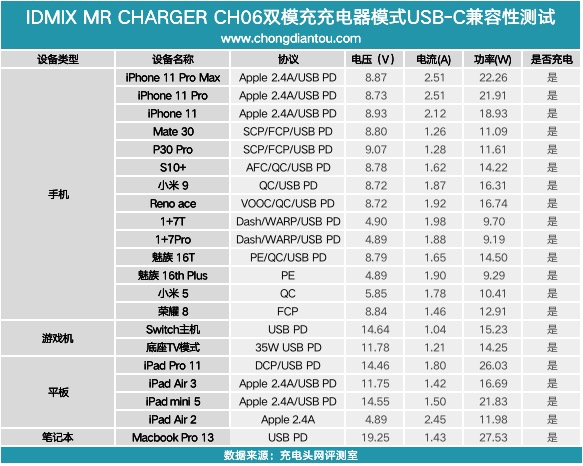 (2)USB-C将USB-C输出测试数据整理出来,从数据上来看,MacBook Pro和iPad Pro 11充电功率自然排在前面,随后是支持PD快充的苹果设备,支持PD快充的安卓设备紧随其后。此外,产品在作为充电器模式使用时USB-C接口还支持QC和FCP快充协议。