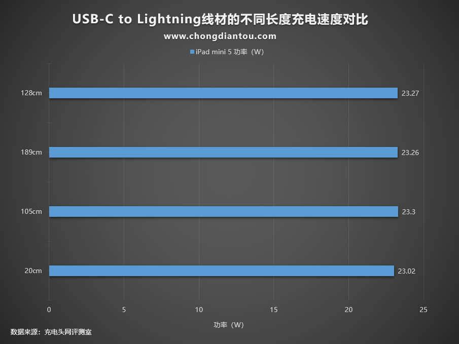1、iPad mini 5将四条数据线为iPad mini 5充电的数据放在柱状图当中, 从数据上看,四个充电功率均在23W左右,处于同一充电水平。