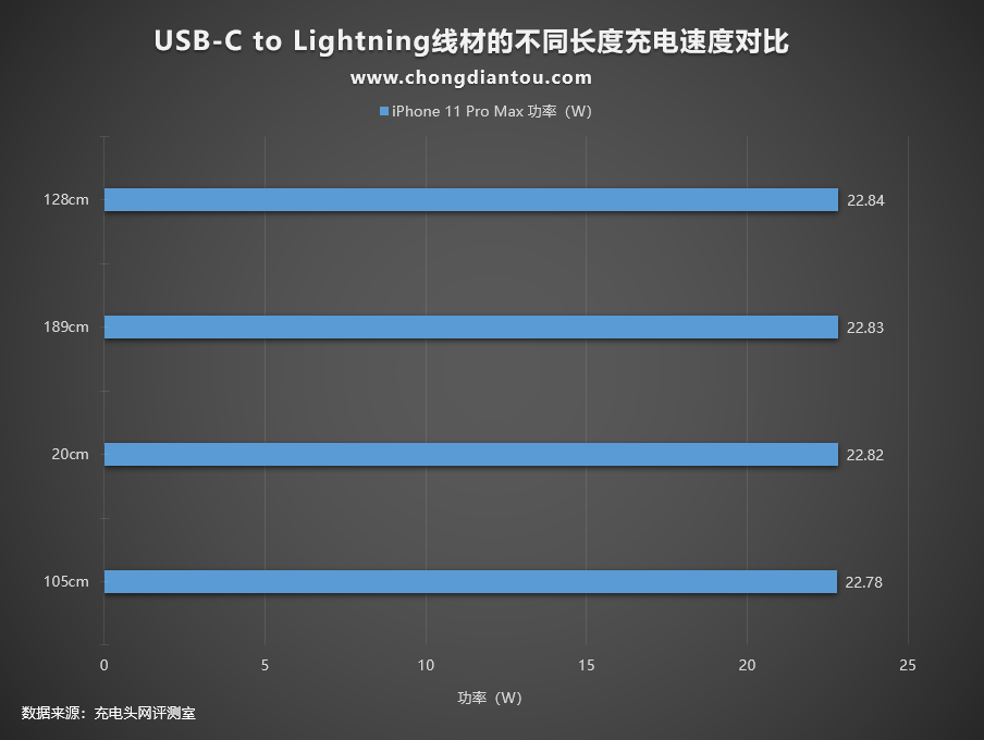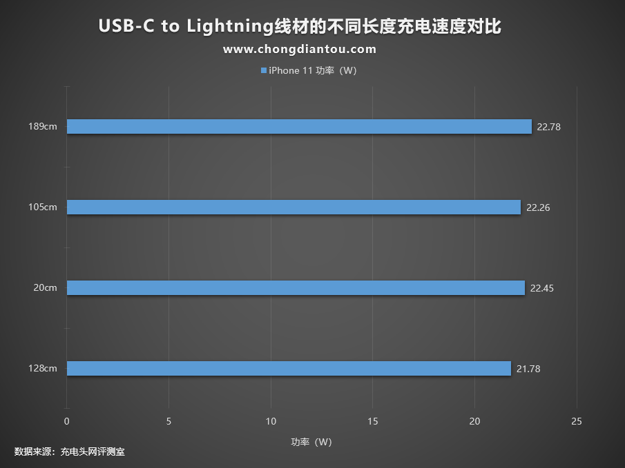 3、iPhone 11将为iPhone 11充电的数据放在柱状图当中,得到的数据处于同一水平,均在22W左右。
