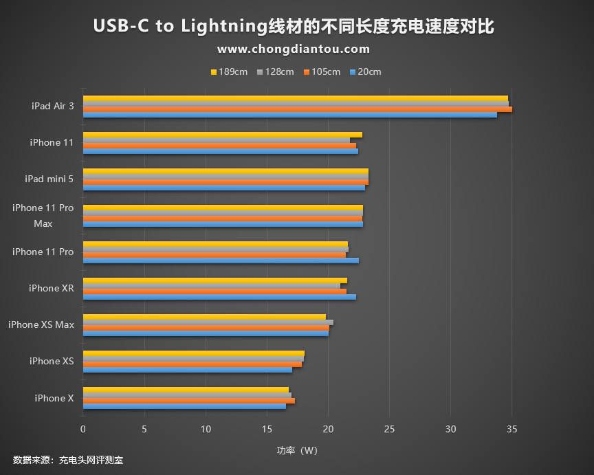 以上对七款支持PD快充的手机和两款iPad进行了充电测试,将测试的数据集中汇总到表格当中,从数据上看,四种不同长度规格的数据线在为手机或者平板电脑充电时功率并没有太大的变化,功率大小浮动处于正常的变化范围,四种线材的充电成绩可以理解为相同。