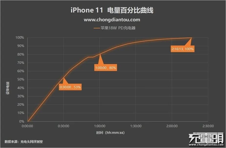 小编选取了支持USB PD快充的iPhone 11作为测试对象,先看看苹果原装18W PD充电器测试数据。半小时苹果原装18W PD充电器对iPhone 11充入了53%电量,1小时充入80%电量,全程充满时间为2小时16分钟。