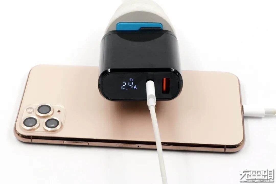 为iPhone 11 Pro Max充电,电流表显示当前处于9V PDO输出状态,电流为2.4A,可以判断出功率是21.6W处于快充状态。