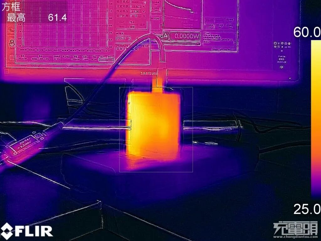 室温25度的环境下,华科隆30W 1A1C PD数显充电器按照额定功率20V1.5A进行满载,1小时后使用FLIR热成像仪拍摄发热图,最热处温度为61.4度,温升36.4度。