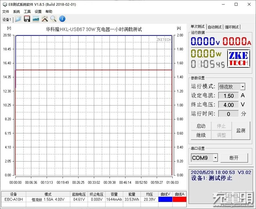 按照20V 1.5A标称额定功率对充电器USB-C进行满载测试,测试过程中电压值呈水平直线,无明显波动情况,长时间满载也十分稳定。