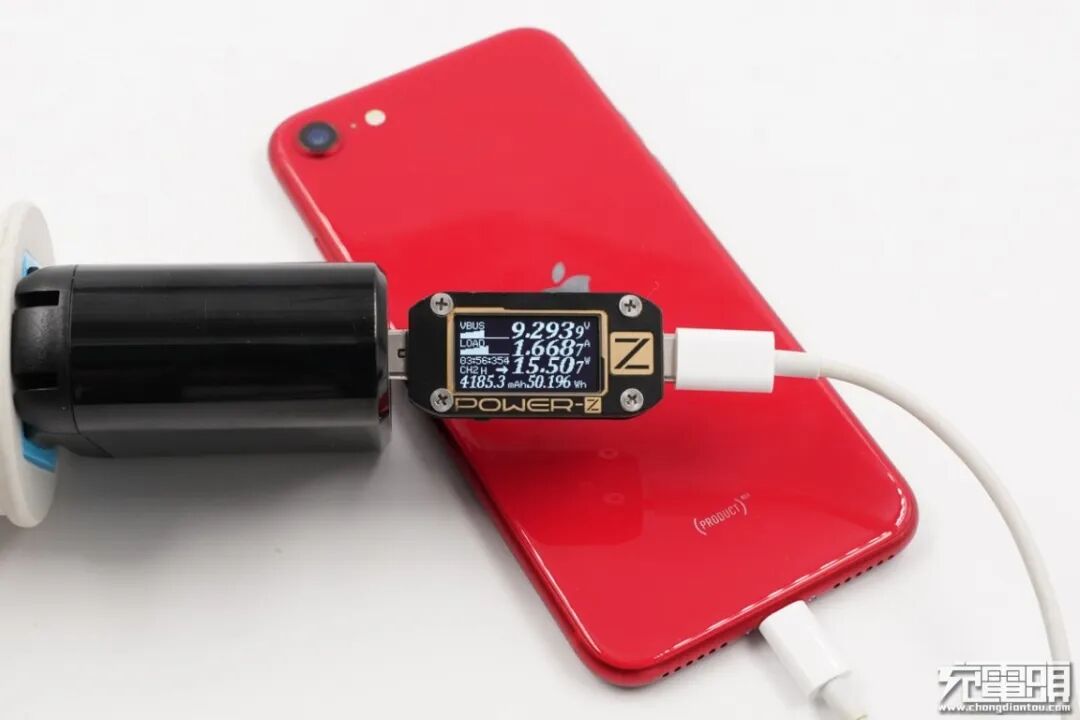 iPhone SE支持USB PD和Apple2.4A快速充电协议,使用USB-C为iPhone SE充电,功率为9.29V 1.66A 15.5W,成功握手USB PD快充,并达到USB PD快充功率最大阶段。