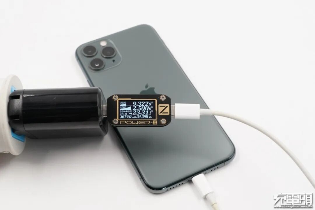 iPhone11 Pro支持USB PD和Apple2.4A快速充电协议,使用USB-C为iPhone11 Pro充电,功率为9.32V 2.5A 23.31W,成功握手USB PD快充,并达到USB PD快充功率最大阶段。