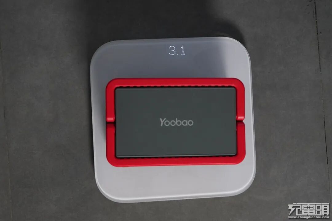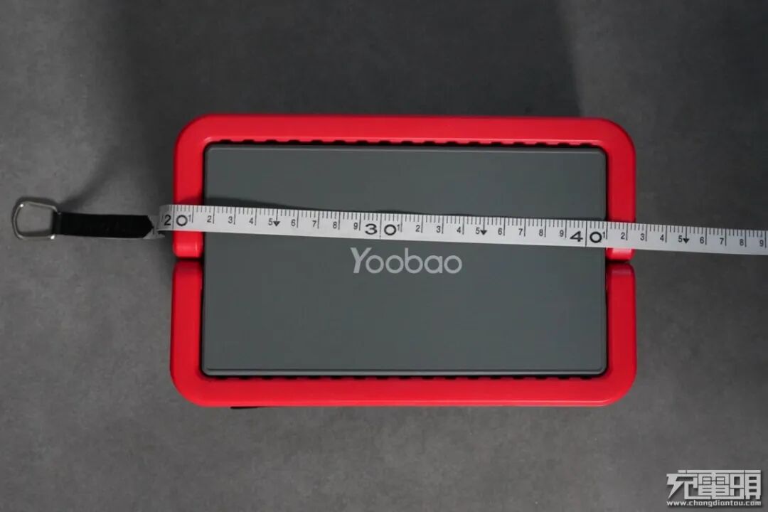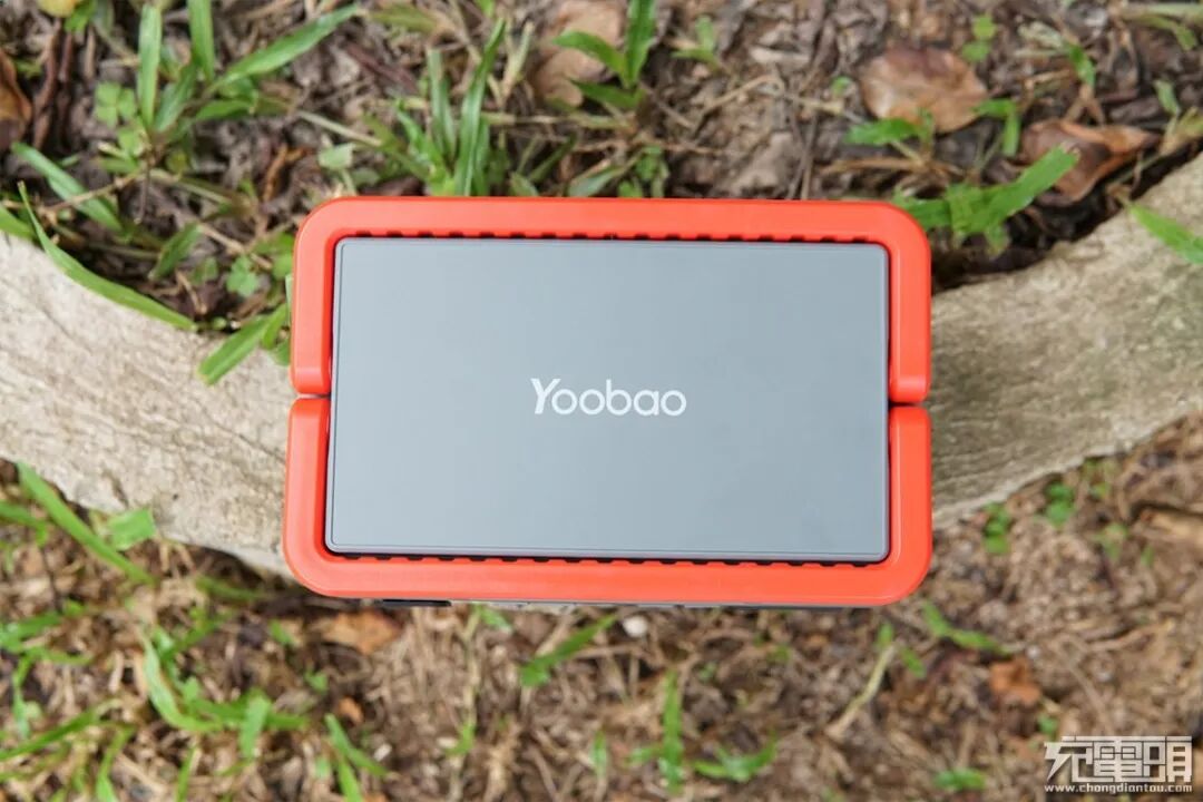 户外电源的顶部,灰色的背景上丝印了白色的Yoobao Logo,此外电源的提手采用了折叠式的设计,不使用时,可以将把手放下,这样整个户外电源看上去更加的工整同时也方便用户收纳整理。