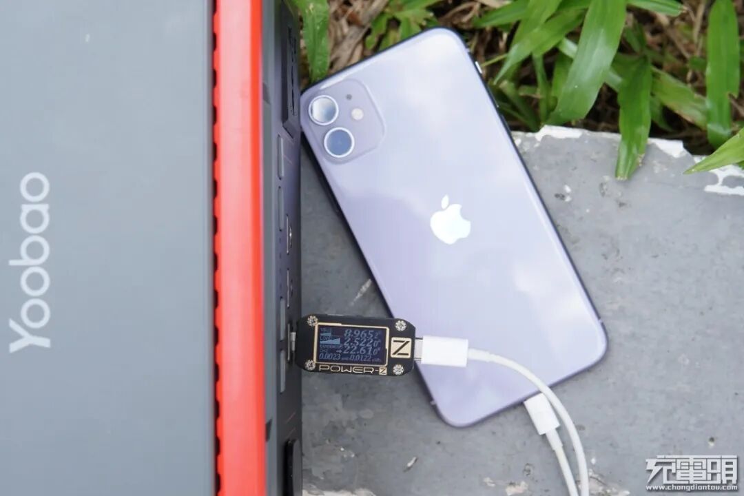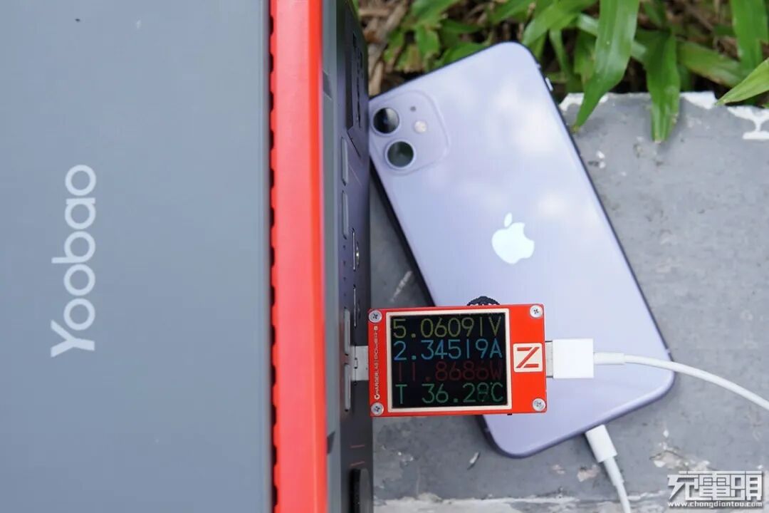 丰富的输出接口使得羽博EN300户外电源可以支持多种设备的充电,首先使用USB-A为iPhone 11充电,功率为5.06V 2.34A 11.86W,成功握手Apple2.4A快充协议。