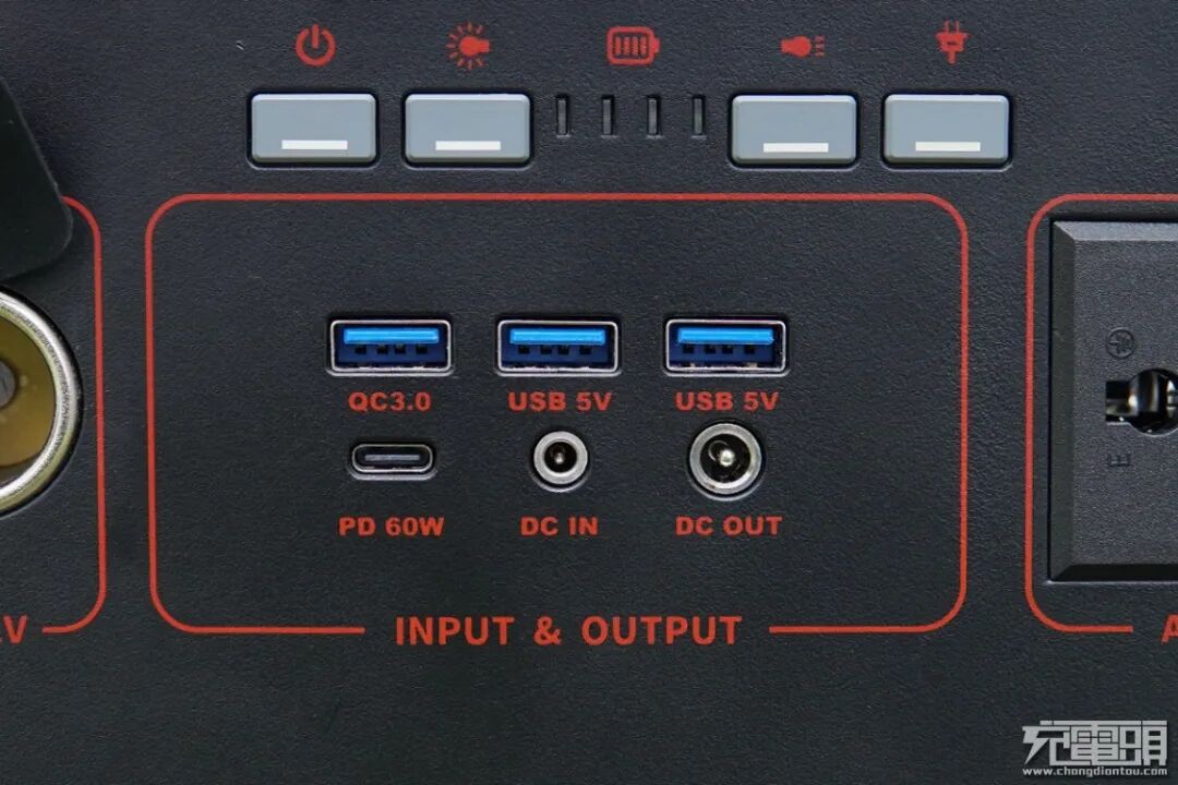 接口面板的中间部分,带有三个USB-A输出接口,其中一个支持QC3.0的快充,下方是一个支持PD60W的双向快充接口,右侧为DC输入和输出的接口。
