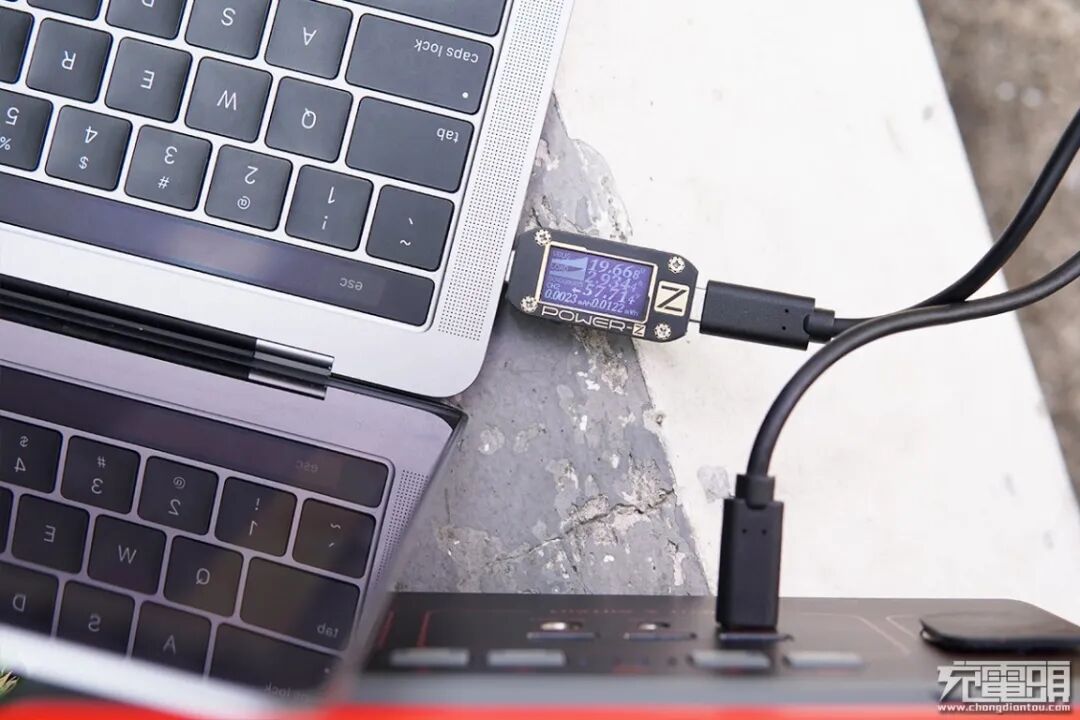 使用USB-C为MacBook Pro充电,功率为19.66V 2.93A 57.71W,成功握手20V电压档位,开启PD快速充电模式,并达到快充功率的最大阶段。