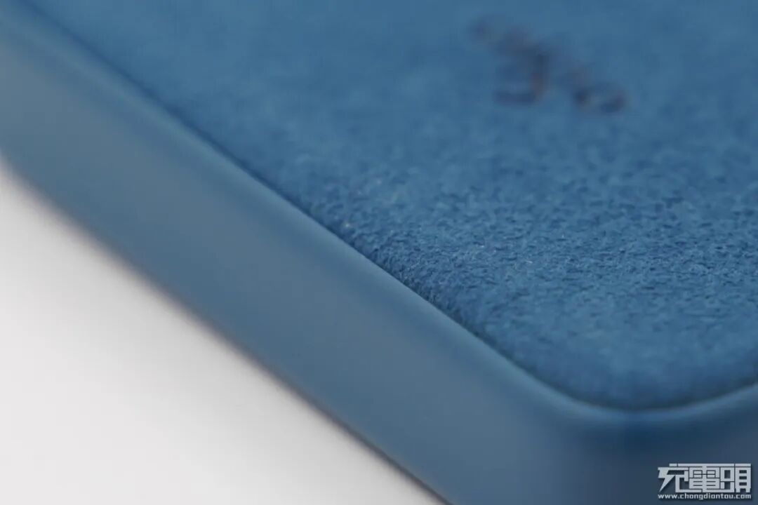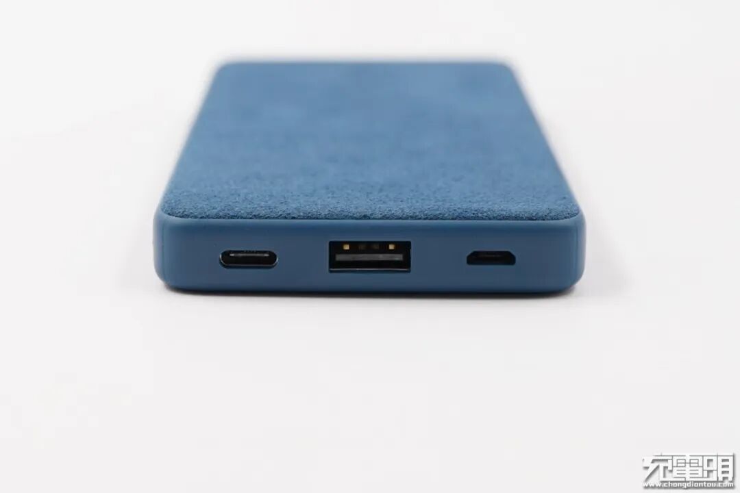 aigo的这款移动电源整体呈现蓝色的外观,绒面的超纤工艺外壳设计使得整个移动电源的握持感不错,移动电源的重量约为182g,出行携带方便没有压力,而且10000mAh的电池容量也保证了电池容量够用,并且侧面还带有快充指示灯,无论是为移动电源自身充电还是为设备充电,是否快充一目了然。