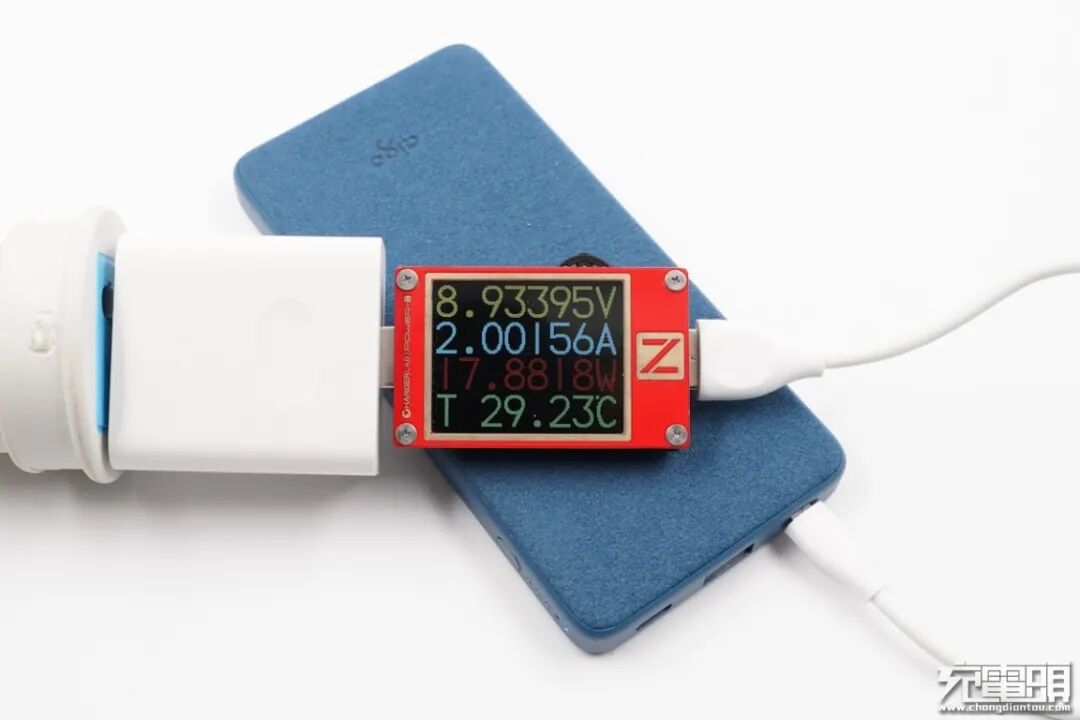 通过MicroUSB接口为移动电源充电,功率为8.93V 2.00A 17.88W,成功握手9V电压档位,开启快充输入模式。