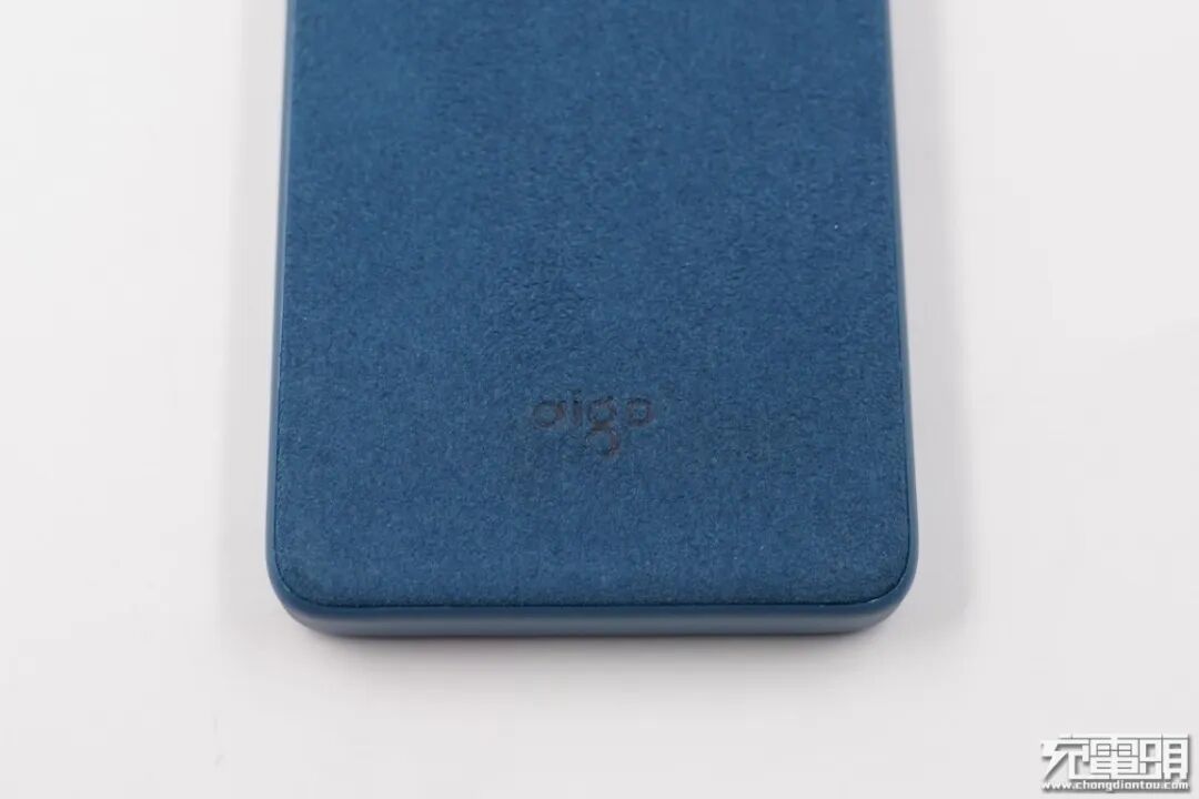 移动电源的外壳采用了绒面的超纤工艺搭配硬塑的外壳,整体质感不错,机身轻巧,便于携带。正面的超纤工艺外壳隐藏着黑色aigo的Logo。