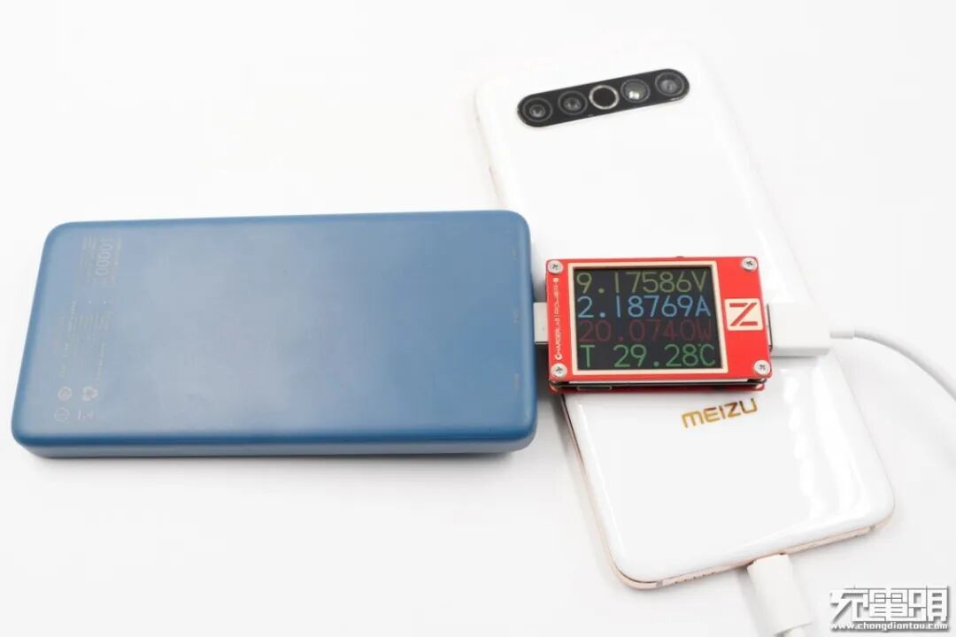 对移动电源的USB-A的充电兼容性进行测试,魅族16th Plus仅支持PE快充协议,使用USB-A为魅族16th Plus充电,功率为7.13V 2.82A 20.16W,成功握手PE快充协议。