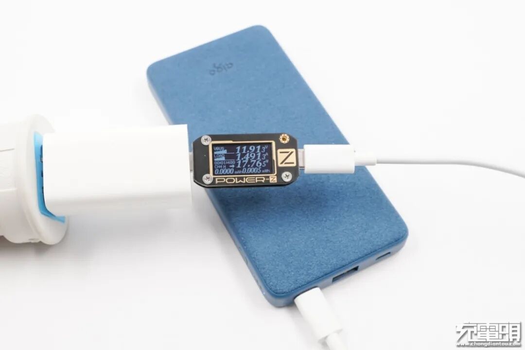 对移动电源的输入进行测试,使用PD充电器为移动电源充电,功率为11.91V 1.49A 17.76W,成功握手12V电压档位,开启PD快充输入模式。