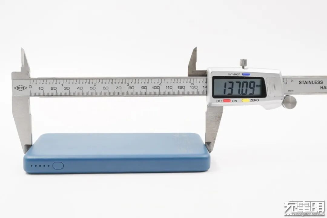 看一下移动电源的外壳体积参数,使用卡尺测得长度约为137mm。